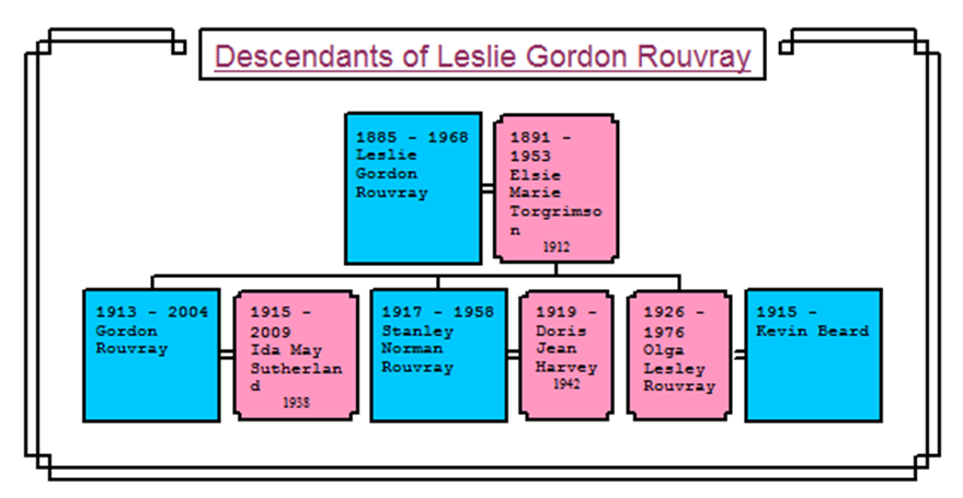 Leslie Gordon married Elsie Marie Torgrimson, born about 1891, daughter of Nicolai Torgrimson and Sophia Brasslin. Leslie managed a store at Dookie, Victoria. They had three children: